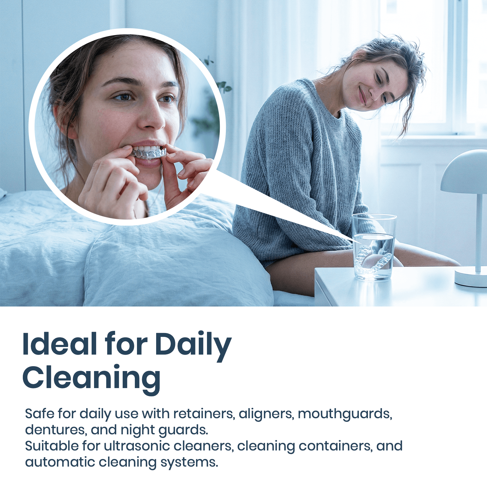 Genug vom Einweichen und Schrubben Ihres Retainers? Lassen Sie leistungsstarke Reinigungstabletten für Zahnapparaturen die Arbeit übernehmen – einfach in Wasser auflösen oder im Ultraschallreiniger verwenden und in nur wenigen Minuten eine gründliche, hygienische Reinigung erzielen.