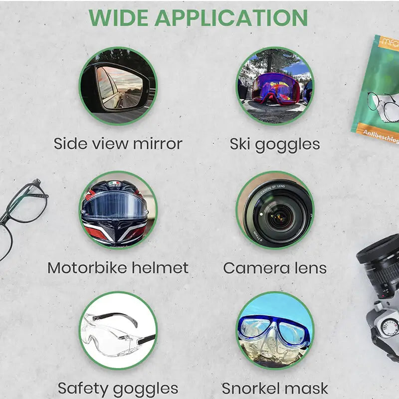 This anti fog glasses wipe leaves no residue or streaks. Just rub it on your dry lenses and a transparent nano-coating will protect your glasses from fogging.